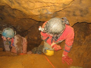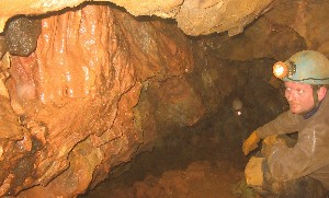 From the Hall, going West, is a slightly awkward short and low traverse over Ochre Passage on past the scratched icons of a couple of birds on the left hand wall with a “long P” symbol (? the ro of a chi-ro symbol, denoting Christianity), on the floor here is a delicate bat skeleton and what appears to be a rabbit(?) skeleton to a narrow passage leading to the Western Cavity; on the right hand wall as you approach are an array of indeterminate scratches directly opposite an awkward left/right turn into Corduroy Crawl (two planks on the floor protect some c.1794 knee marks, showing the imprint of corduroy trousers) and an inclined upward squeeze into the “Upper Horizontal Western Cavity” where much stal has been collected by the miners but sufficient remains for it to be well worth seeing.