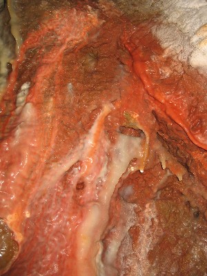 Superb clean walls everywhere throughout the cave display many fossils and sections of magnificent multi-coloured stal (yellow, red, white, orange) and also some good examples of green marl in small neptunian dykes – mostly in The Hall and The Dungeon).