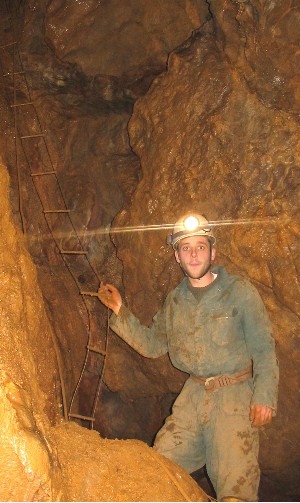 Andy H at base of ladder climb in The Hall up to Harford’s Balcony and beyond