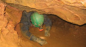 Graham M of UBSS crawls through into the Upper Horizontal Western Cavity extension approaching the flowstone walled section