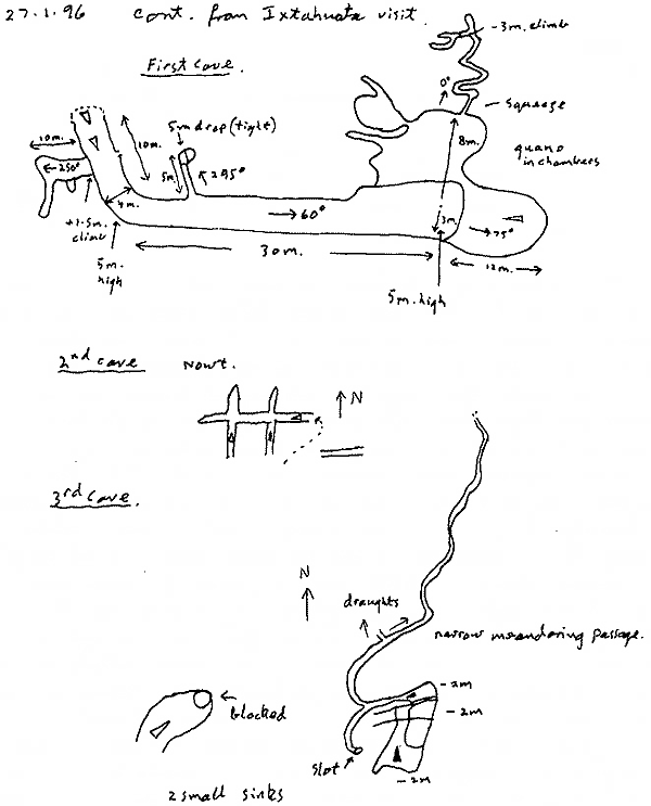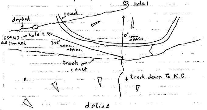 1st cave about 80m down valley through coffee bushes. Climb down into 4m wide hole heading roughly south. Passage 4m wide, 5m high swings to to north east ends in a chamber after about 50m. Small passage heads north for 30m to a 3m pot to nothing. Various tight sinks in cave but no draughts and no leads.